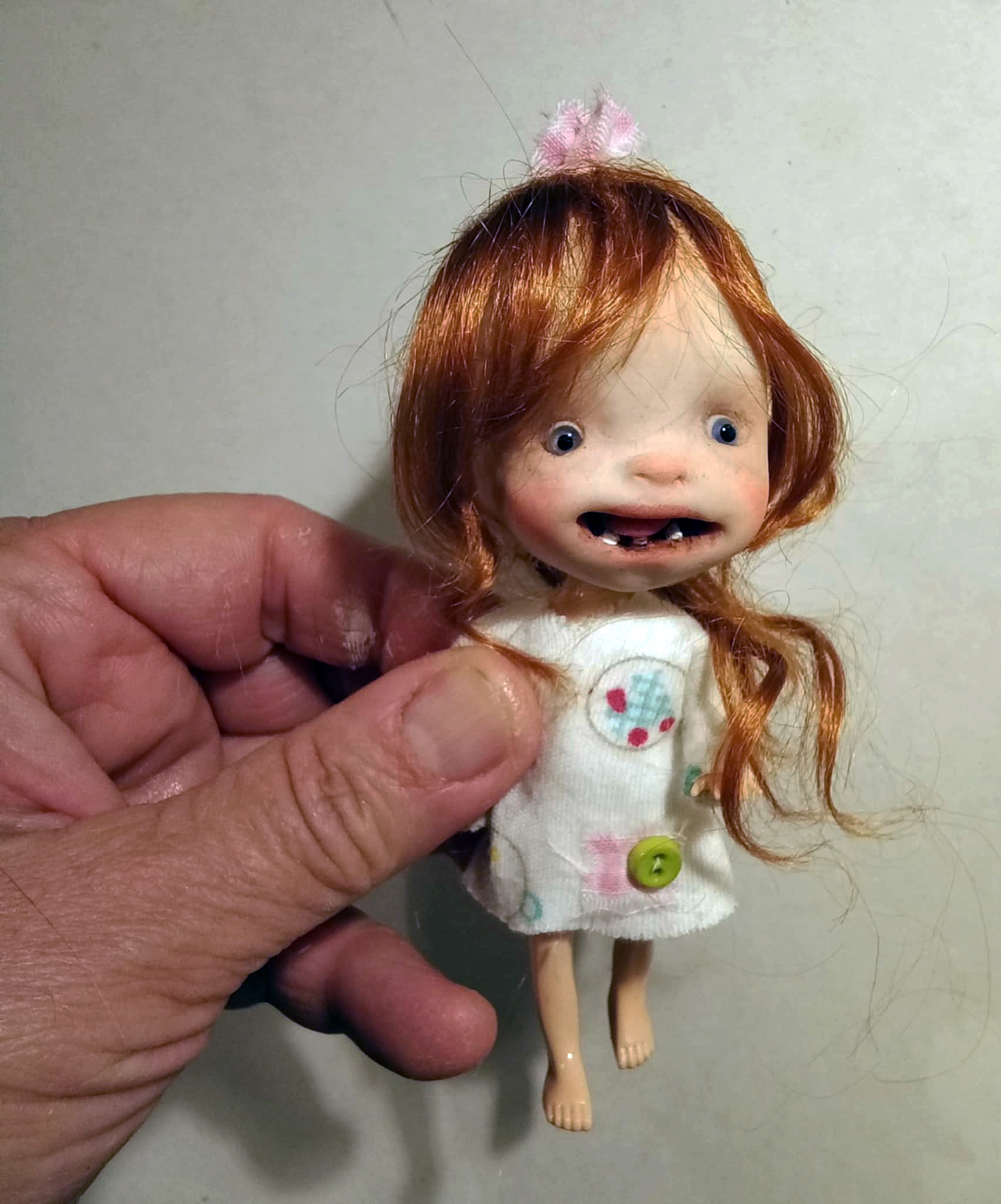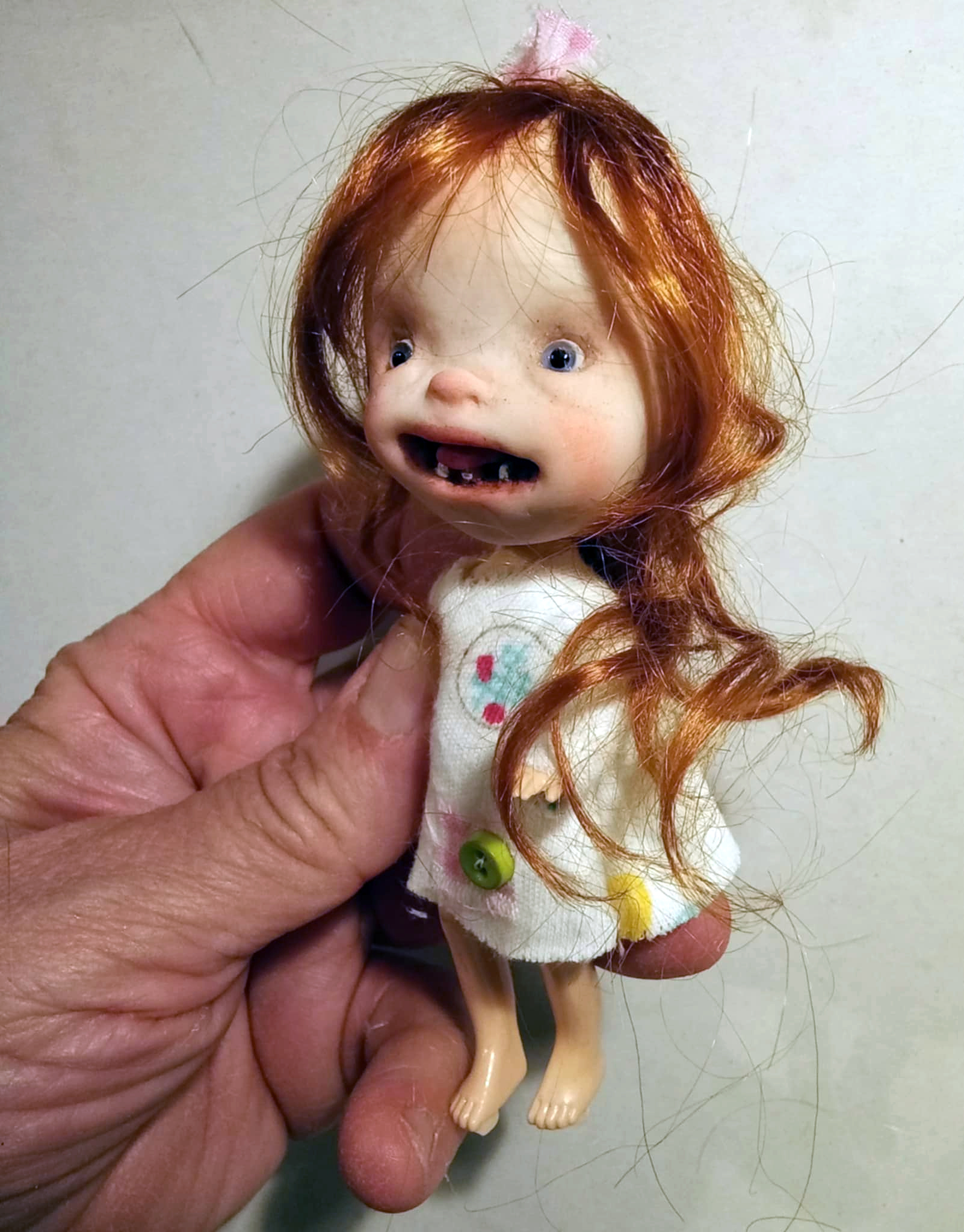 Dolly’ girl, size is 14cm.She has a hand sculpting head, joints assembled body,mohair hair,g eyes ,hand painting eyes,also a handmade dress.Thank you for supporting handmade art ![]()