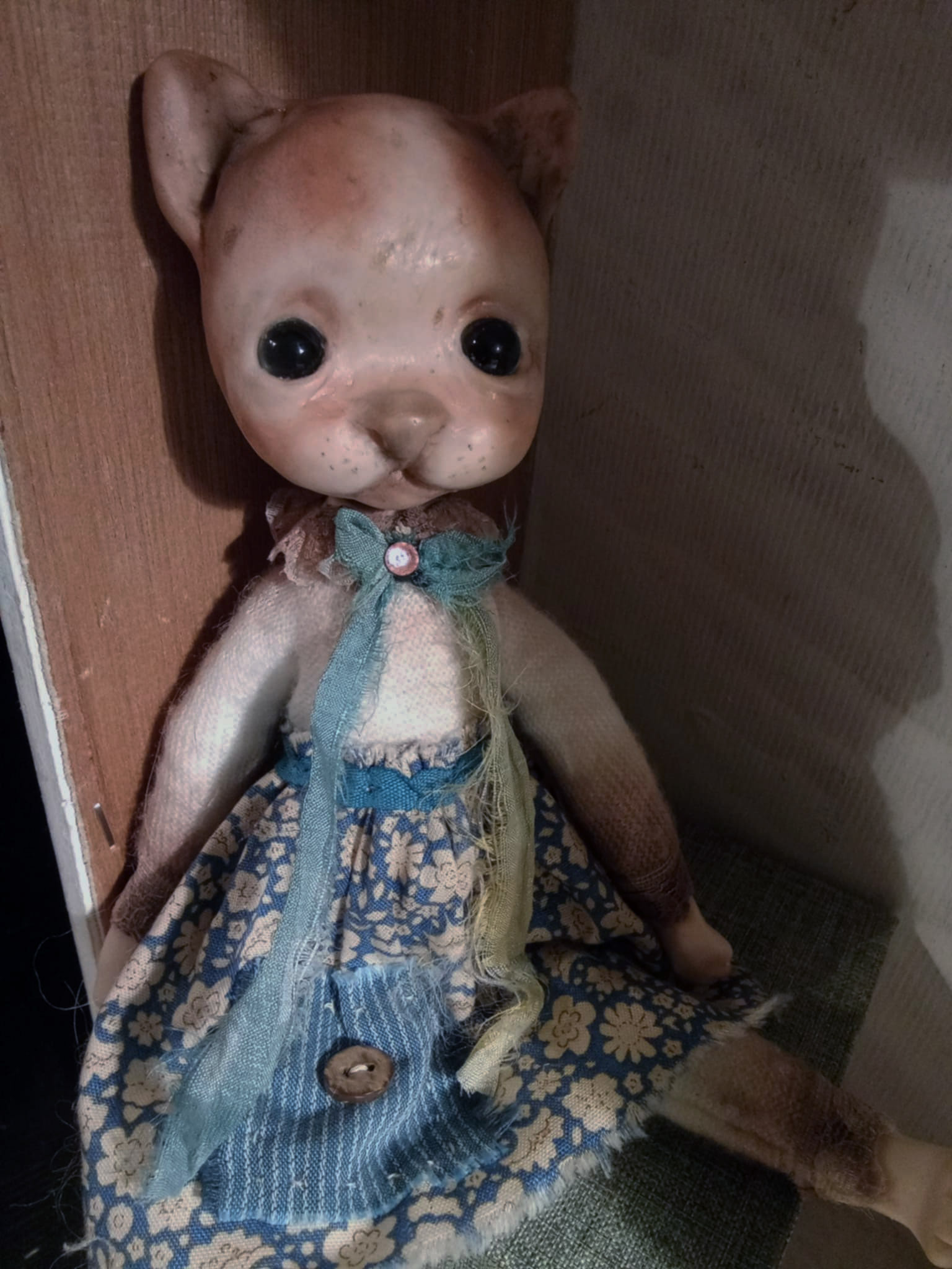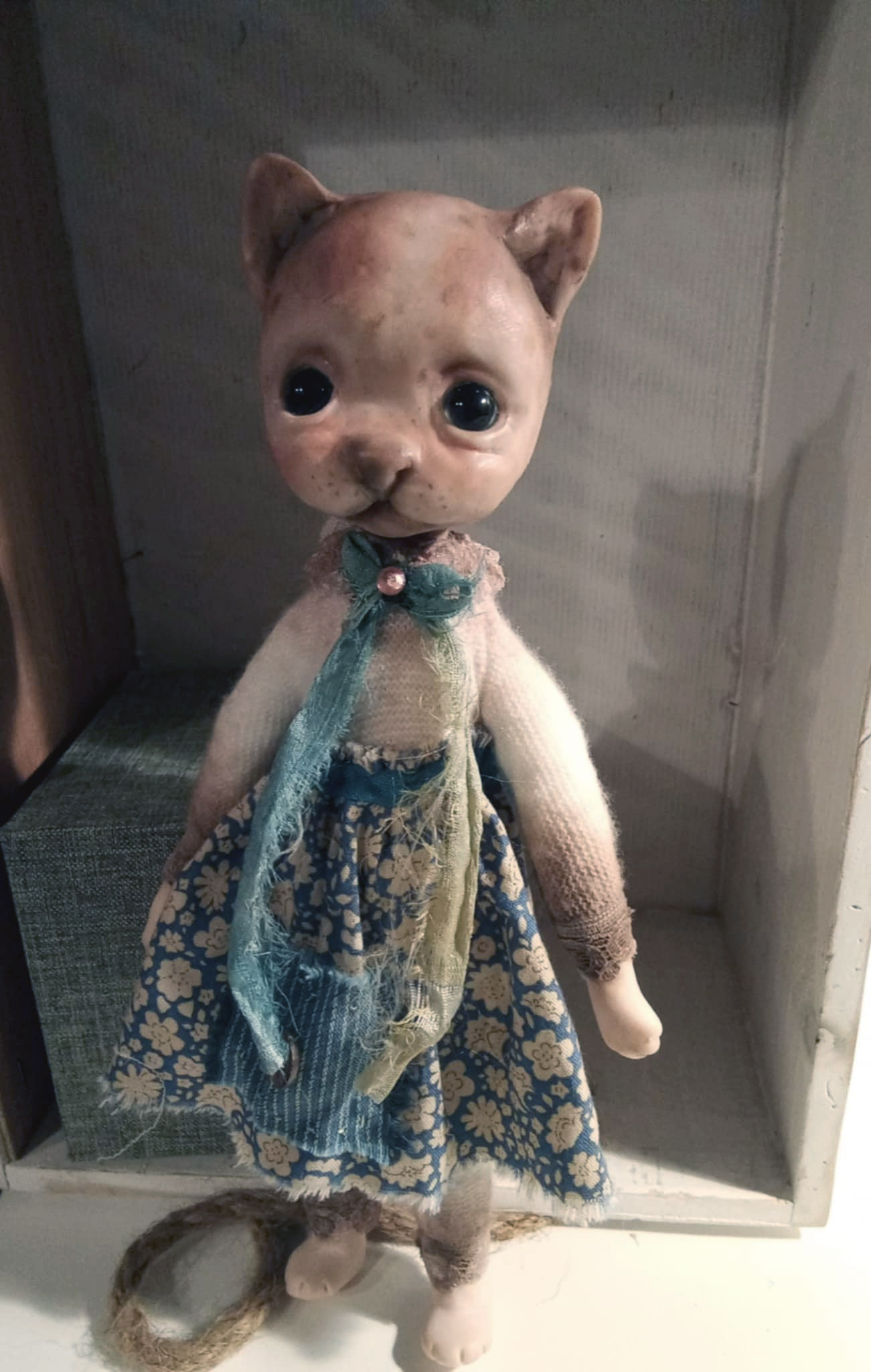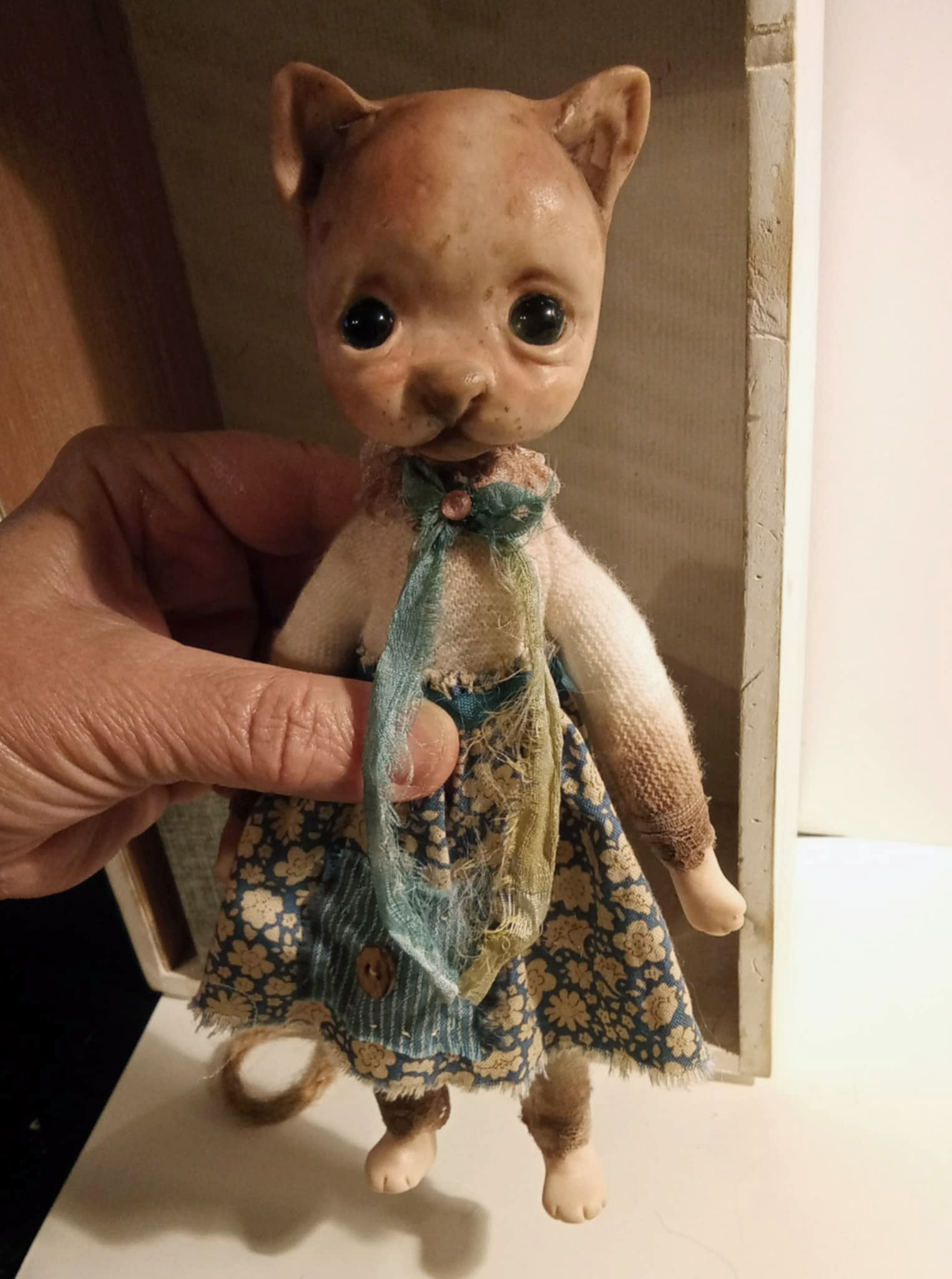 She is an OOAK 22cm 8.5 inches doll by me Chrishanthi,her name is Kitty Bella’.My sculptures are unique pieces(OOAK) : the head body and neck, arms and legs are individually modeled in polymer clay , which will be fixed in its final shape after heating in an oven at 135 degrees. There is no mold: the final piece is the original, and there is no possibility of making a copy. To make a new doll, I have to create the head, the hands, the legs again, each time.